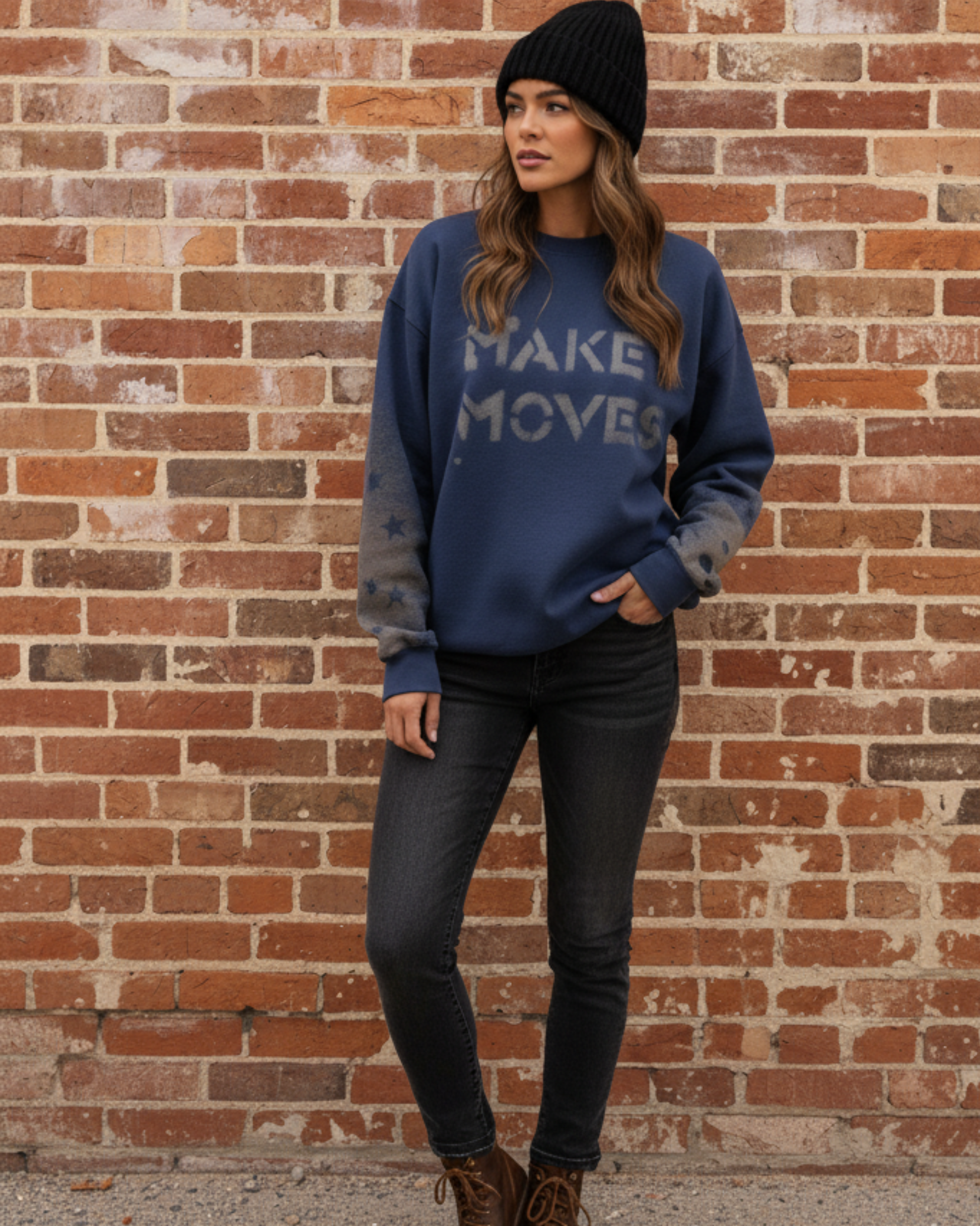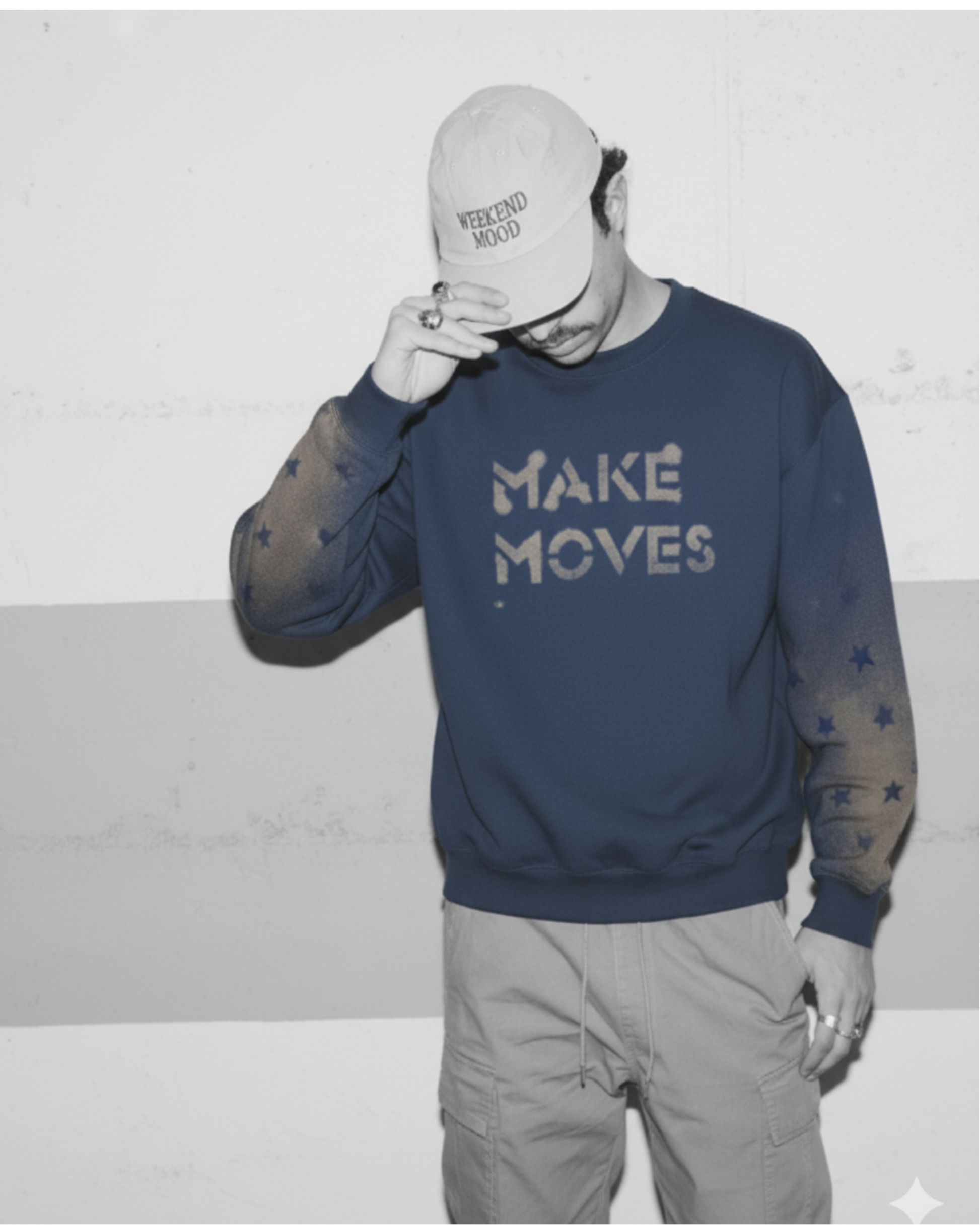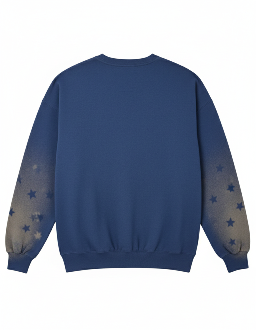 The Starlit Moves Crew brings cosmic energy to everyday hustle. Handmade and one-of-a-kind, each sweater is crafted with custom bleach-fade star sleeves that guarantee no two are ever the same.